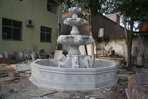 Фонтан из солнечного мрамора с богатой резьбой, украшенный несколькими лошадьми и головой льва в качестве излива. Этот фонтан идеально подходит для наружного применения в любом климате. Свяжитесь с нами сегодня для получения дополнительной информации.