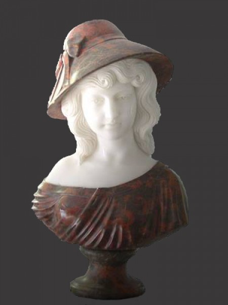Фантастический портрет молодой аристократки из невероятных цветовых сочетаний мрамора! Сияющий белый мрамор подчеркивает нежную красоту ее лица и локонов, блестяще контрастирующих с коричневым цветом ее костюма и шляпы.